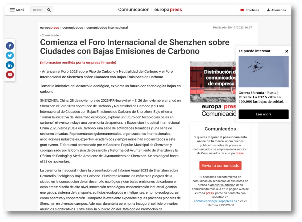 Europa Press欧罗巴通讯社报道:Comienza el Foro Internacional de Shenzhen sobre Ciudades con Bajas Emisiones de Carbono