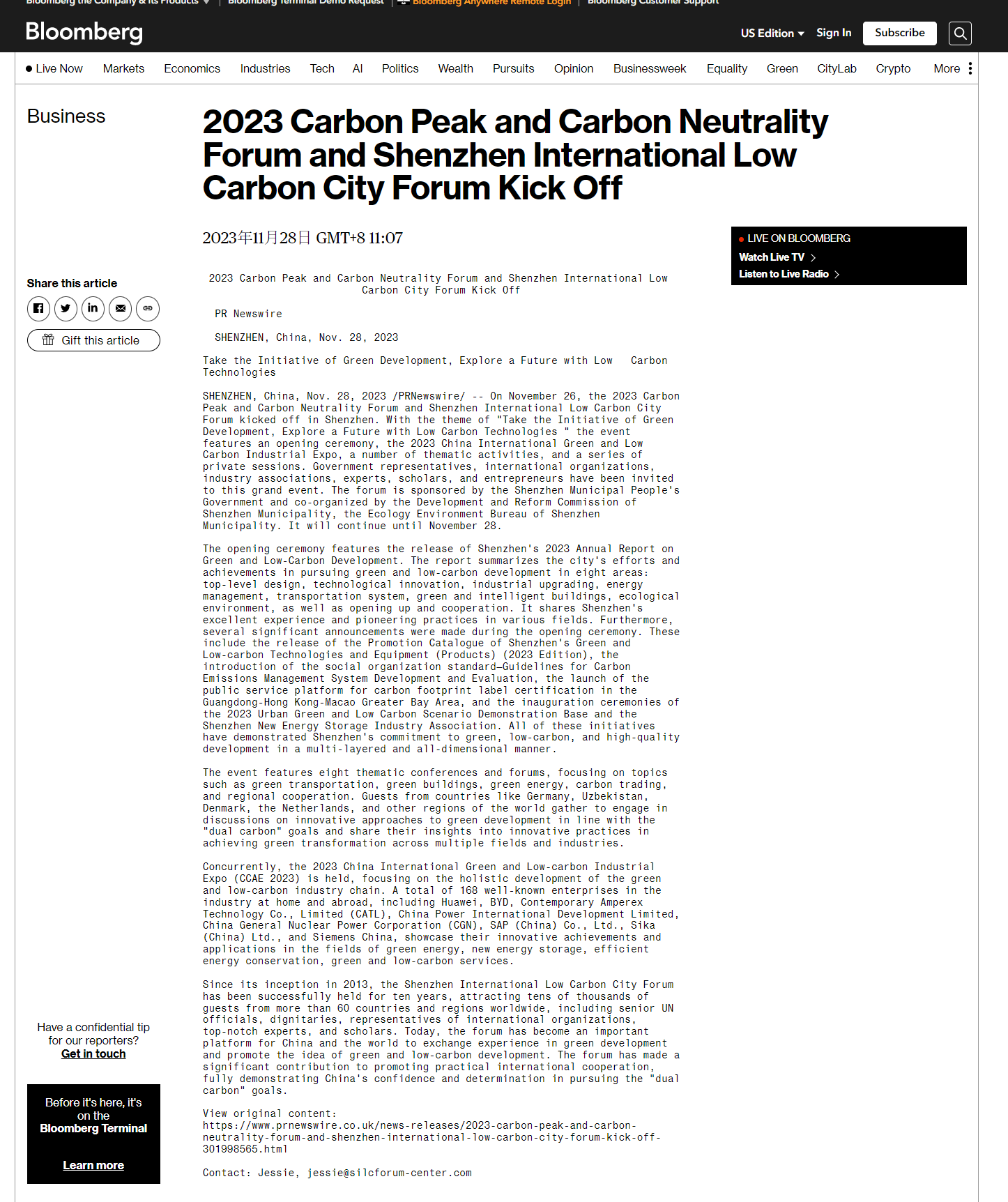 Bloomberg - GLO【彭博社】报道:2023 Carbon Peak and Carbon NeutralityForum and Shenzhen International LowCarbon City Forum Kick Off
