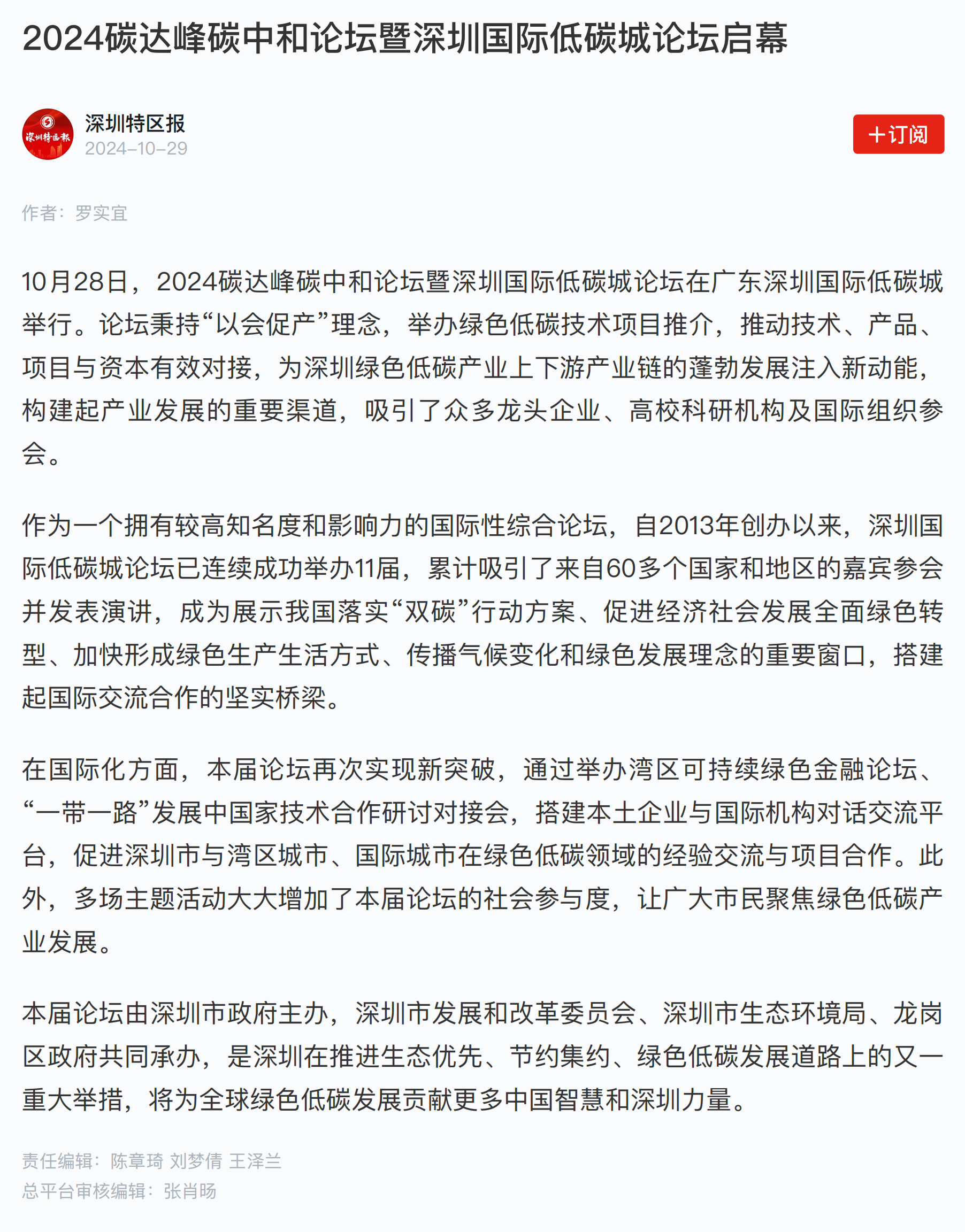 深圳特区报|2024碳达峰碳中和论坛暨深圳国际低碳城论坛启幕