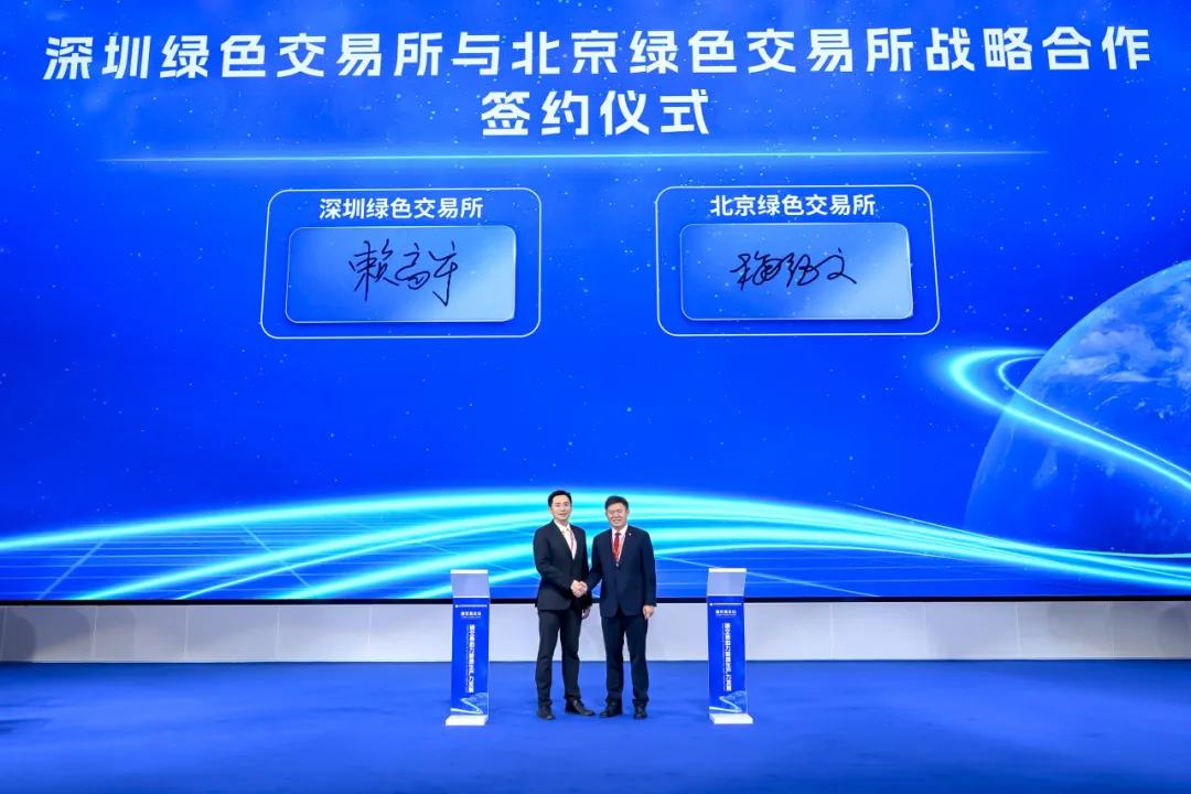 论坛上,深圳绿色交易所与北京绿色交易所开展了战略合作签约,这是两地首次从企业碳账户、气候投融资、碳金融业务、交易合作、培训服务等领域全方面开展区域合作。